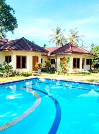Fasilitas yang tersedia kolam renang, akses pantai, WiFi, untuk harga permalamnya sekitar Rp1.800.000 – Rp3.000.000 per malam, dengan kapasitas 6-8 orang.